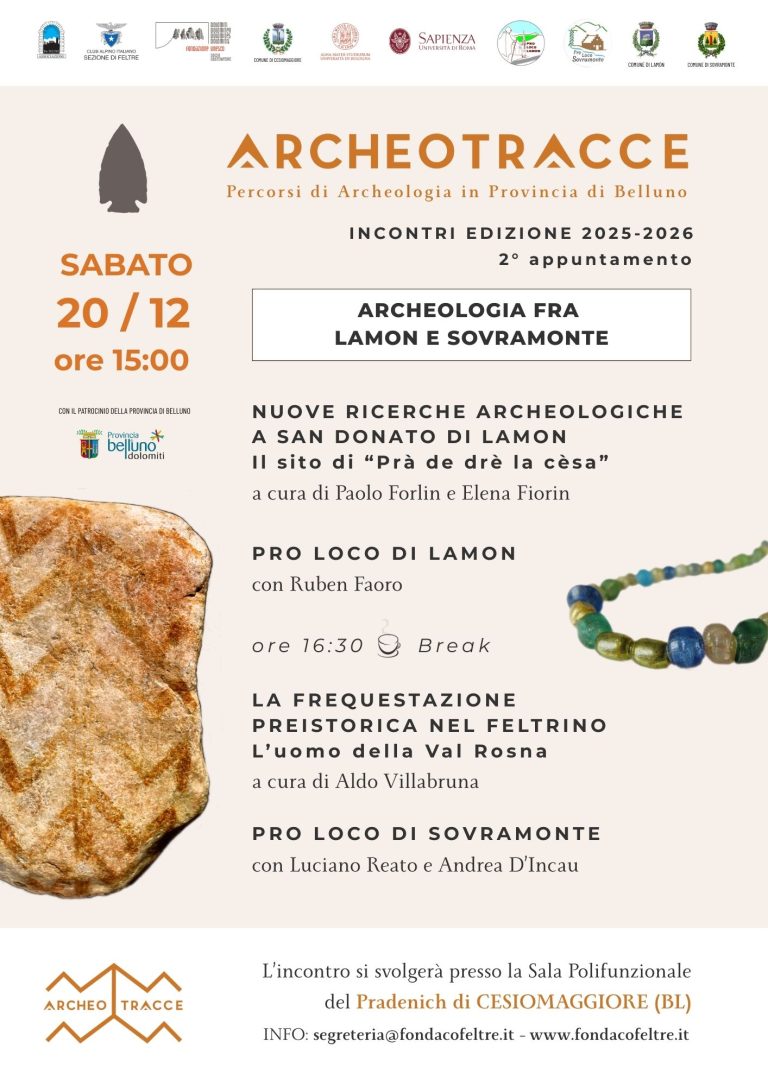 L’incontro, dal titolo “Archeologia fra Lamon e Sovramonte”, sarà dedicato alle più recenti ricerche archeologiche condotte nel territorio e offrirà uno sguardo approfondito sulla archeologia dei due territori, mettendo in dialogo ricerca scientifica e valorizzazione locale.