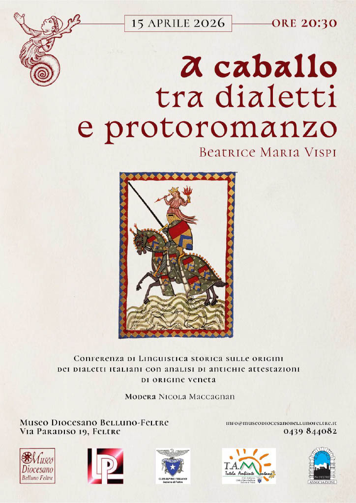 Mercoledì 15 aprile 2026, alle ore 20:30, il Museo Diocesano di Feltre ospita un incontro aperto al pubblico dedicato alla storia e alle origini dei dialetti italiani: A cavallo tra dialetti e protoromanzo.
